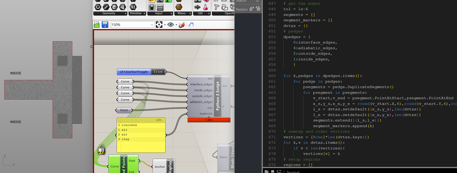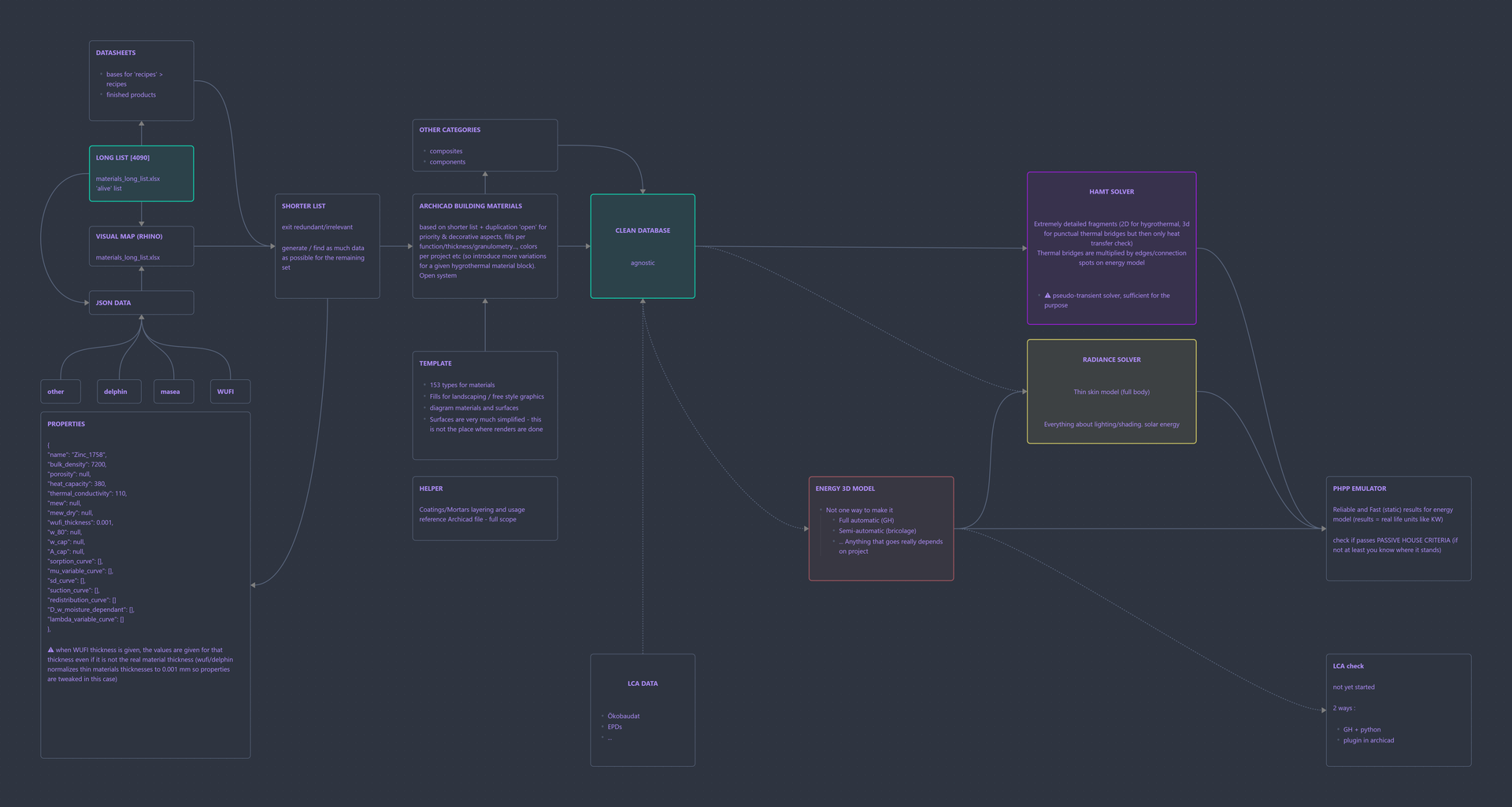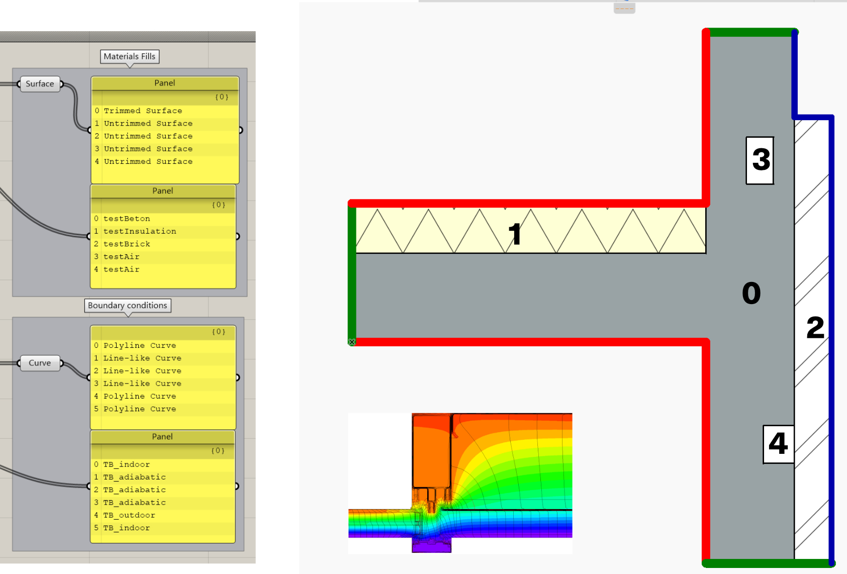 - Normally the Passive House checks are processed through an excel sheet (PHPP) and partly with a plugin Sketchup . Not very efficient to fill cells one by one or using Sketchup, it would be better to use directly the programs I use to model already. So I have built an autonomous 'calculator' version of PHPP, which can be plugged on a rhino model. It was also necessary to make a daylight/shadow solver and a thermal bridge solver. I thought I was done, but then a big RED FLAG showed up : impossible to get away with moisture risk-assessment only using the classic Glaser 1d diagram. Why : it is inaccurate with Hygroscopic materials and now bio-based materials are required, which are hygroscopic. Way too little attention is given to this. So again it was necessary to roll up my sleeves and make a simulator for that. It exists already (Wufi and Delphin), but it is expensive, and you need to redraw the details specifically for the software. So I'm writing a useful alternative, together with a large, practical materials database. Sure none of those tools are certified, but what matters is that they are not returning false results, serving directly within the design process so iterations are easier.